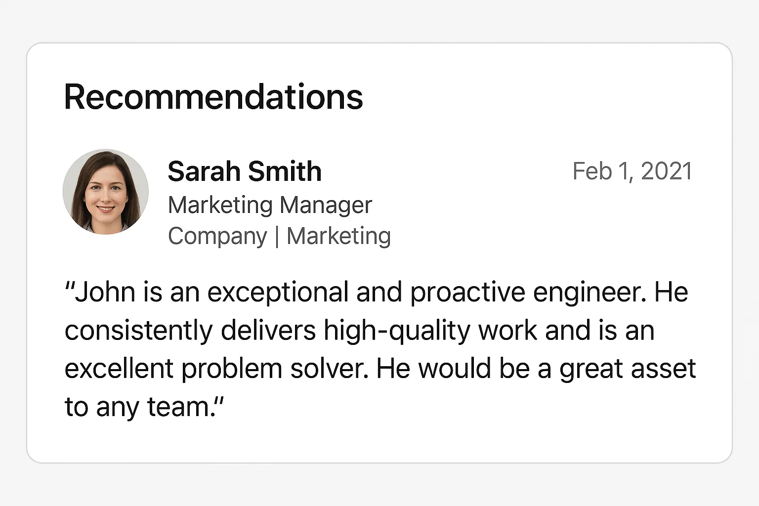 Example layout of a LinkedIn recommendation with profile photo and review text